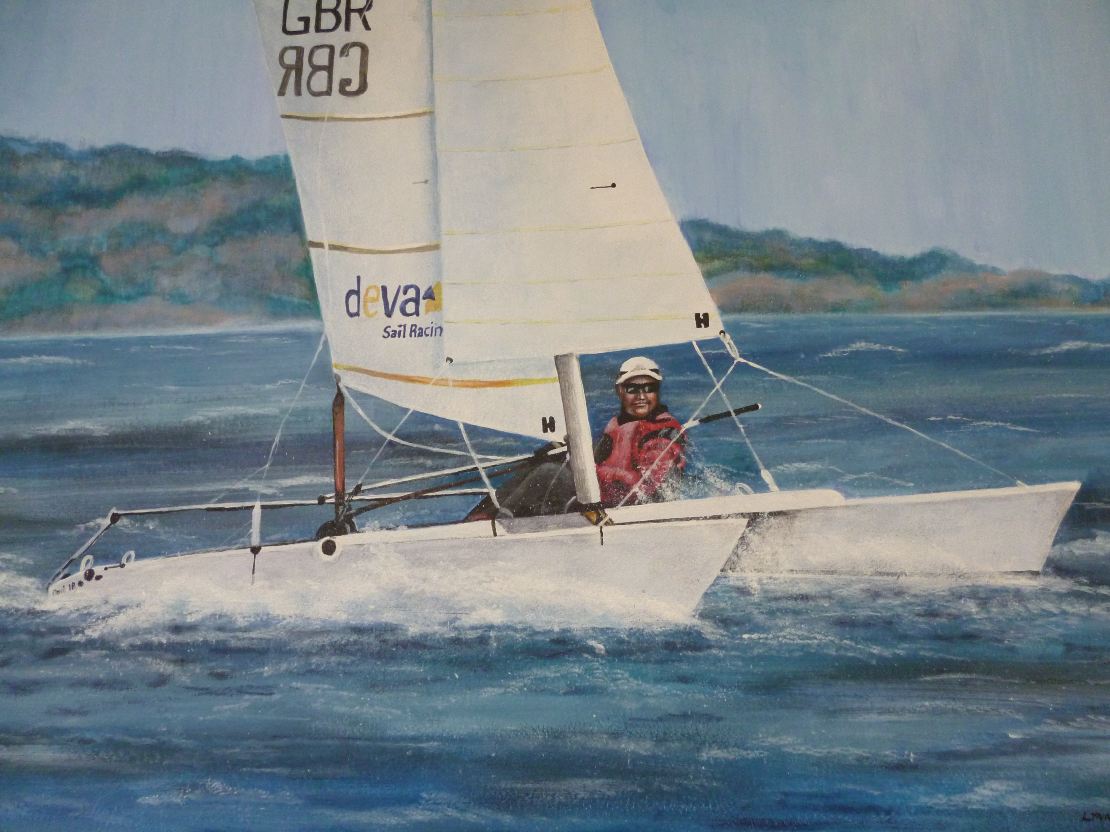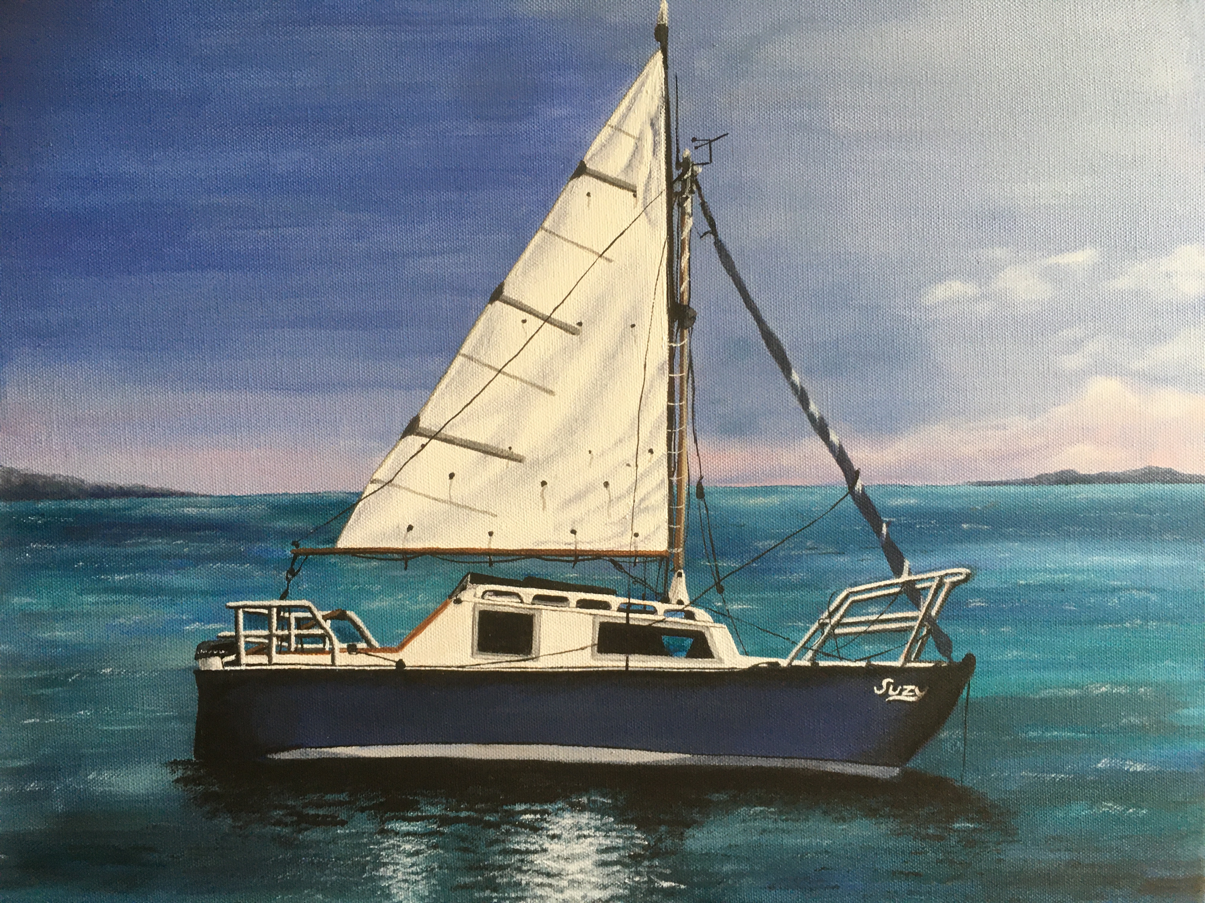 Sailing is a huge part of this person's life. The subject of this work is of course Simon and his catamaran, but creating this painting gave me the opportunity to portray the sea, land, and sky, which I'd not had much practice in up until now!