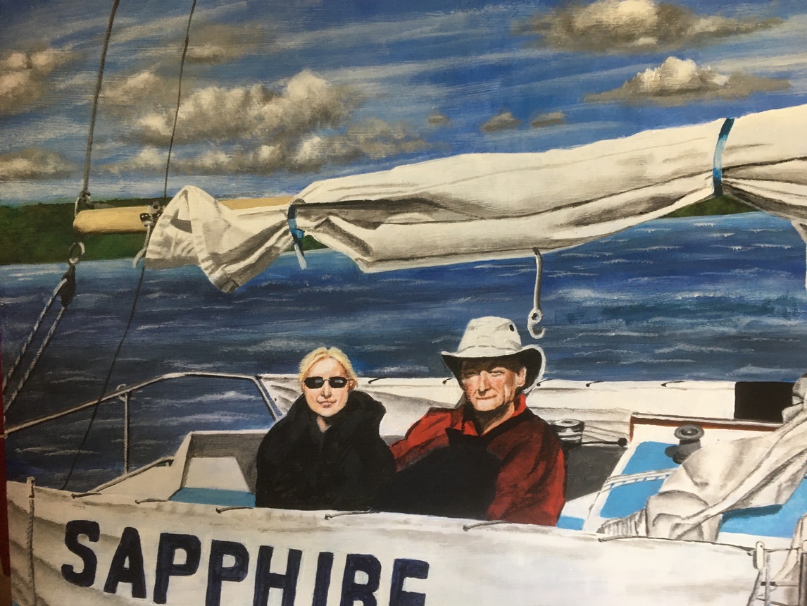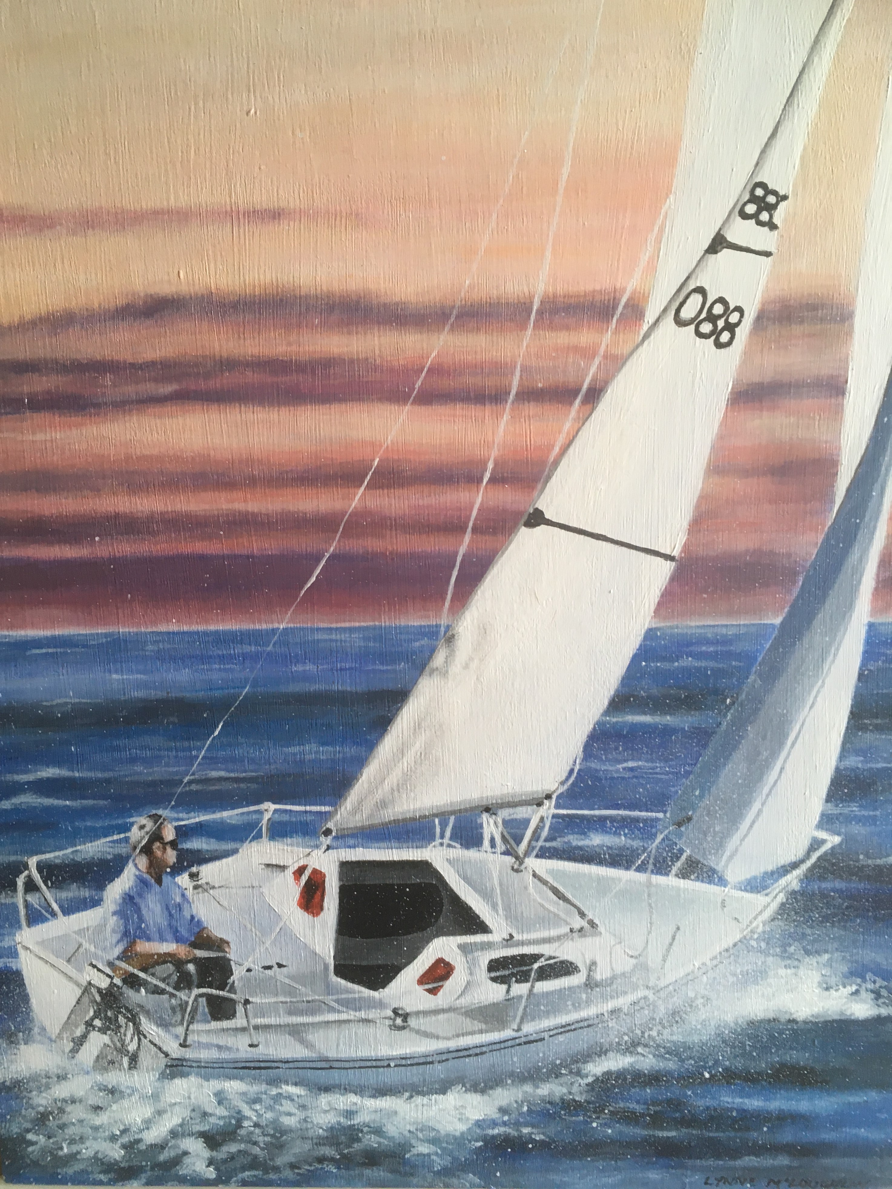 This is Robin, sailing his beloved boat "Dolce Vita". I cheated a bit with this one.......the sky in the original photos was the "normal" blue with white cloud. I substituted it with this sky at sunset, to give the painting more interest and drama. So, photos are a base to work from, but don't have to be adhered to rigidly!