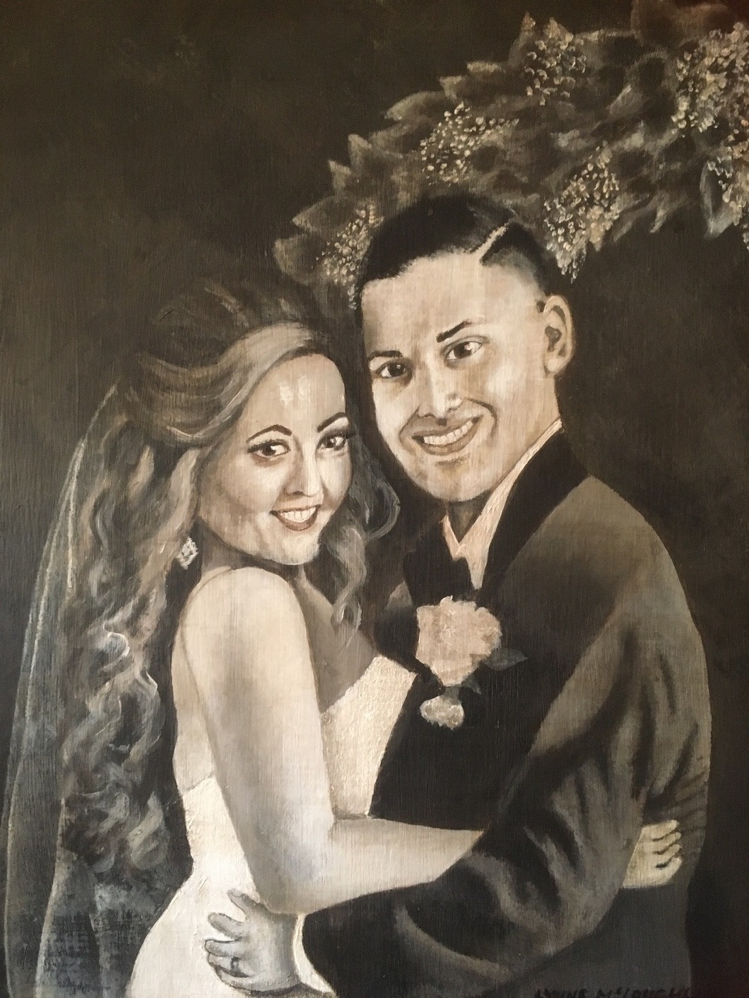 ..........on their wedding day. I've always loved old sepia photos, and in this painting I've strived to recreate those colours, and also to make it appear aged and weathered